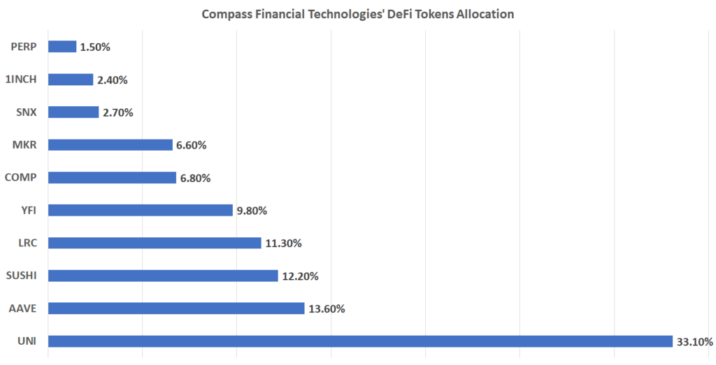 Based in Switzerland, Compass Financial Technologies is holding $5 billion AuM across EU’s exchange-traded products (ETPs). As of yesterday, the index provider announced it will add 10 DeFi tokens into the mix, with the following allocation.