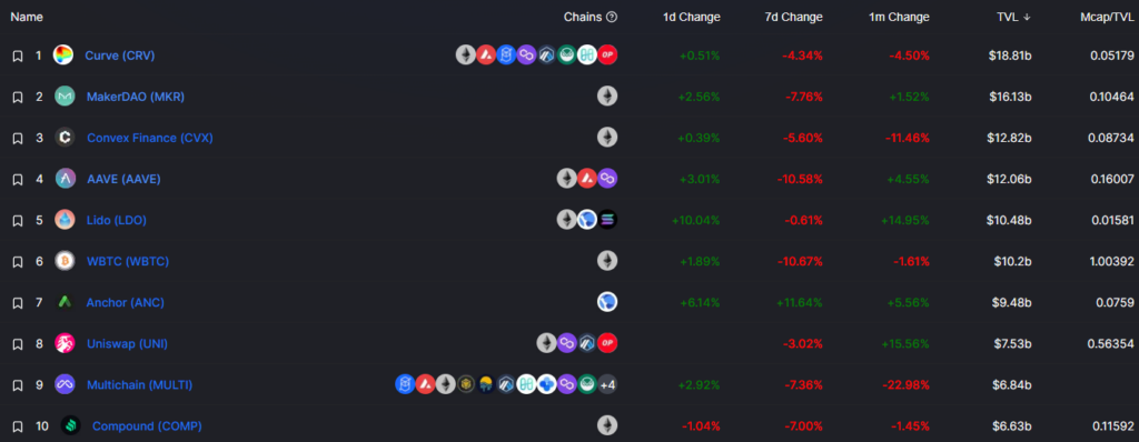 In contrast, the top 10 DeFi protocols all have mcap/TVL ratios well under 1, signifying major undervaluation.