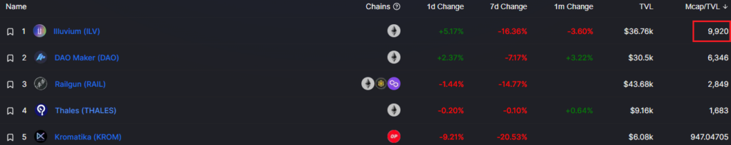 Case in point, the upcoming triple-A blockchain game Illuvium hasn’t yet been released. Meaning, it has no earnings to show for it. Yet, it tops the chart when it comes to its market cap to TVL ratio.