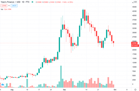In the past three days, the DeFi darling YFI has lost more than 36% of its value, going from $34,400 to $21,950 today.